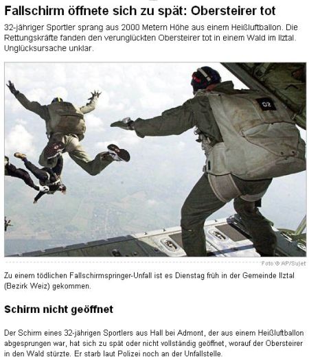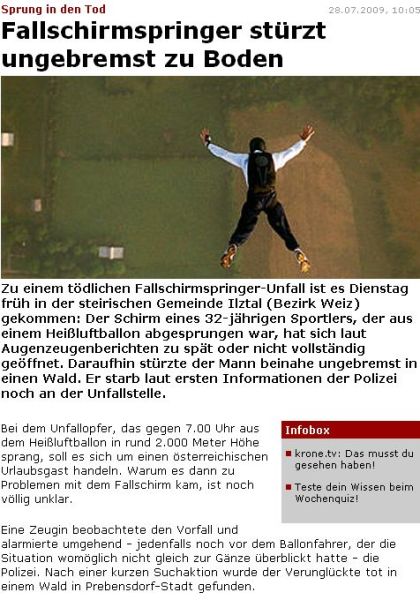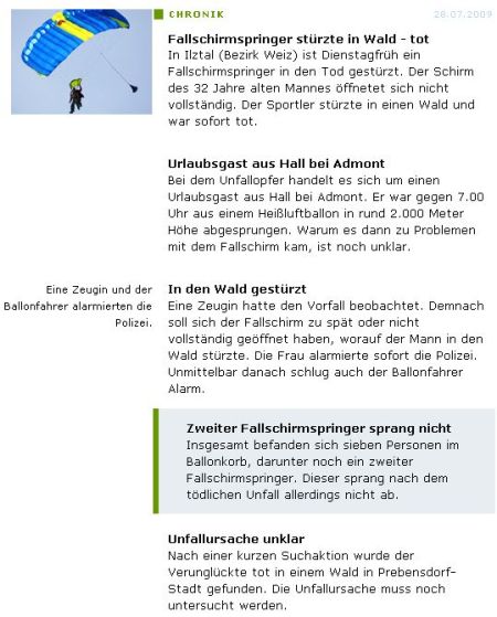 Am 28. Juli 2009 um 07:16 Uhr wurden die FF Neudorf / Grp und FF Prebensdorf von "Florian Weiz" zu einer Suchaktion nach Prebensdorf-Stadt (Nähe: 380KV Stromleitung) gerufen. Ein Fallschirmspringer wurde gesucht. Der Schirm eines 32-jährigen Sportlers aus Hall bei Admont, der aus einem Heißluftballon in rund 2000 m abgesprungen war, hat sich zu spät oder nicht vollständig geöffnet, worauf der Obersteirer in den Wald stürzte. Nach kurzer Suchaktion wurde der Verunglückte nur noch tot aufgefunden. Unglücksursache ist unklar.