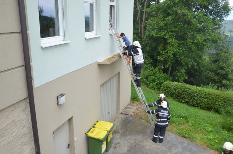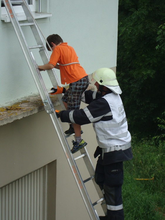 Nach Absprache mit der Übungs-Einsatzleitung wurde die FF Neudorf Großpesendorf zum Evakuieren einer Klasse über eine Steckleiter mit Sicherung durch eine Rettungsleine eingeteilt.