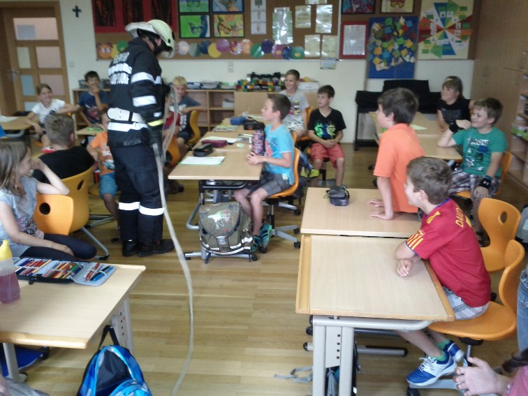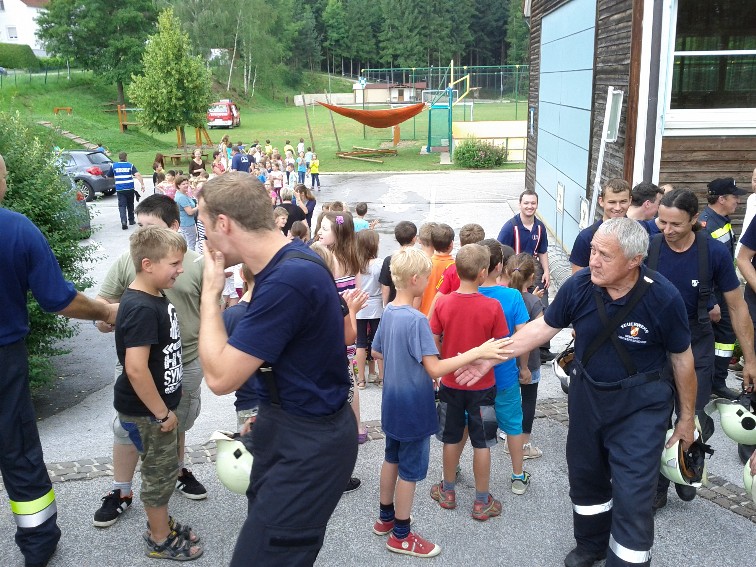 Nach der Übungsbesprechung gab es von den Volksschulkindern einen kräftigen Applaus für die Feuerwehrmitglieder zur gelungenen Übung.