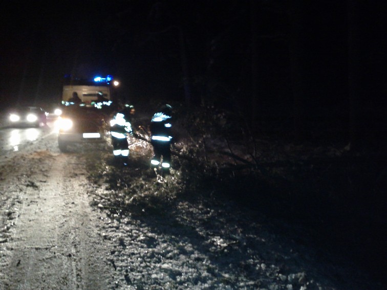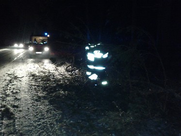 Tätigkeiten: Absichern der Einsatzstelle, Beseitigen des umgestürzten Baumes, Reinigen der Fahrbahn von Ästen und Schnee,