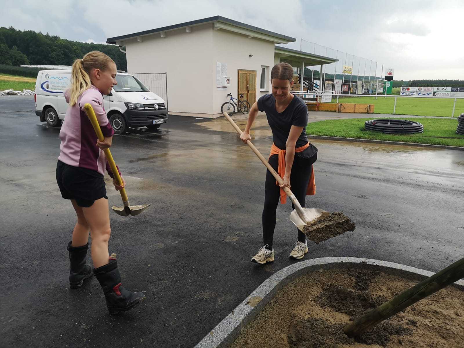 Nachdem sich die Wetterlage zwischendurch entspannt hatte und erste Sicherheitsmaßnahmen wieder entfernt werden konnten, sahen wir uns am 15. Juni aufgrund einer weiteren Gewitterlage allerdings dazu verpflichtet nochmals Vorkehrungen gegen eine potentielle Überschwemmung zu treffen. So bauten wir erneut den Hochwasserschutz in Neudorf auf und schützten das Rüsthaus mit Sandsäcken vor einem weiteren Wassereintritt.